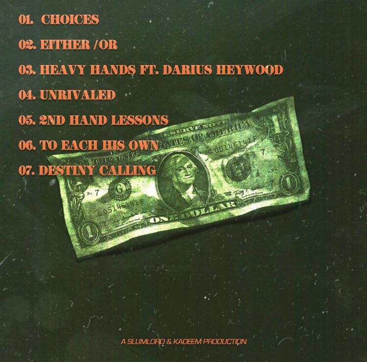 From his previous work, Kadeem shows some maturity and adheres to a theme without trying to be too deep. His content shows a man pondering life’s choices and the nature of making those decisions that impact life. Kadeem avoids sounding cliche with tired punchlines here. SlumLord supplies a simple yet effective canvas for Kadeem to display his smooth, confident style. Kadeem shows that he’s on the right path to continued growth with this latest release.