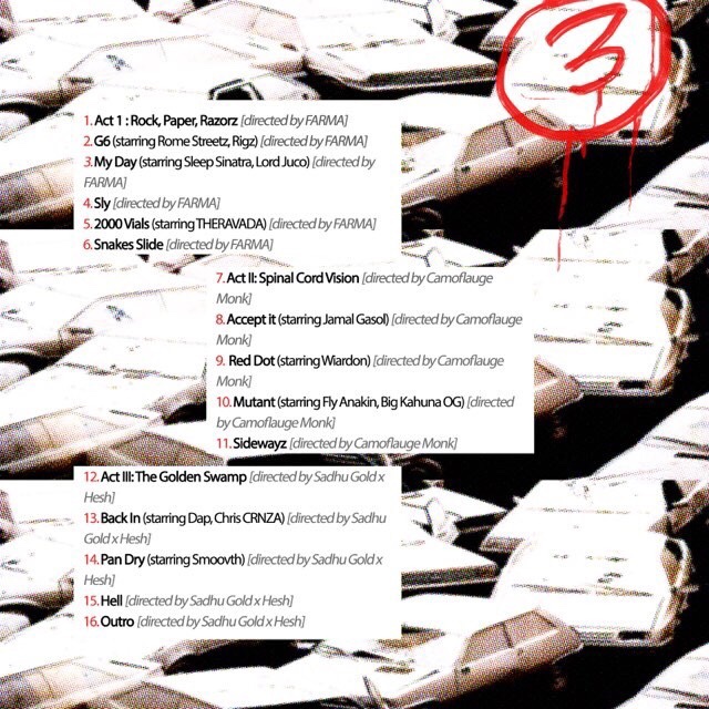 “G6” feat Rome Streetz and Rigz sports chopped violins and thunderous bass. A standout beat on an album overflowing with excellent production. Rome continues to show why he’s one of the best emcees in the game as a top-notch feature like this. Rigz slides through with his sneaky persuasion, like he’s always trying to sell something to the listener. With “My Day” feat Sleep Sinatra and Lord Juco, all three emcees bring their own unmistakable styles to a sweeping strings loop. On “Sly” Farma samples The Five Stairsteps “Danger She’s a Stranger.” Though it may be a prominent sample, the choice fits well with the overall tone of Act I. “2000 Vials” feat Theravada features a tense orchestral loop and lingering bass notes that rattle the speakers. Thrvda brings his serious tone to the track. Not relying on features like on “Snakes Slide,” shows a solo Zay at his best. Here he begins the track weaving a tale of a friend involved in a drug-spot robbery. Pro Zay gets introspective and nostalgic while also looking back at the struggles as well. Over crisp drums, Farma lays a delicate piano loop and booming bass as Zay himself, slides on the track.