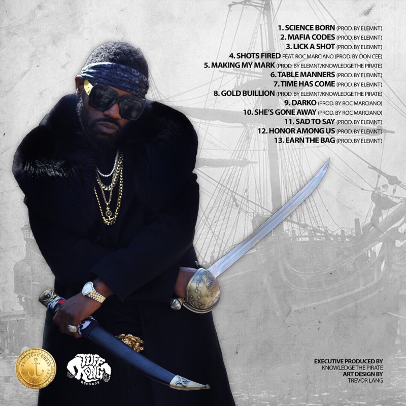 The fluttering horns of “Mafia codes” create the perfect NYC Italian cafe scene for The Pirate to craft a narrative of crime, gambling, drugs and guns. “Lick a shot” features chopped loops of piano slides and an Egyptian sounding organ sample. Knowledge raps of designer brands, riding fast, shots firing from the foreign whip while the women hang on for the adventure. It’s tracks like these that display the typical Knowledge style of luxury raps mixed with a street edge. On “Shots Fired,” Roc Marci lends his rhymes to the Don Cee produced track which sports a playful vocal sample, echoing effects and booming drums. Roc goes first, coming with his seemingly effortless flow and lucid imagery with lines like “Specs of blood on the funk flex Lugz…” Knowledge follows with 2 verses of detailed and engaging storytelling of an undercover agent amidst wild shootouts.