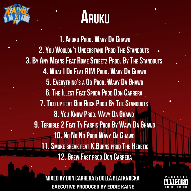 “Terrible 2” Feat Ty Farris, Wavy delivers a bubbling flute loop and stuttering dusty drums as Eddie brings a hype, energetic verse followed by Ty’s focused and technical rhymes. The euphoric, gentle melody on “Smoke Break” Feat K.Burns, produced by The Heretic is fitting for the intended vibe of the track. Eddie closes out Aruku with the poignant and profound “Grew Fast.” Don Carrera crafts a smooth and delicate beat with synths, strings and a slightly funky bassline. Eddie opens up here, showing some self-awareness, discussing becoming a man and covering more personal topics.